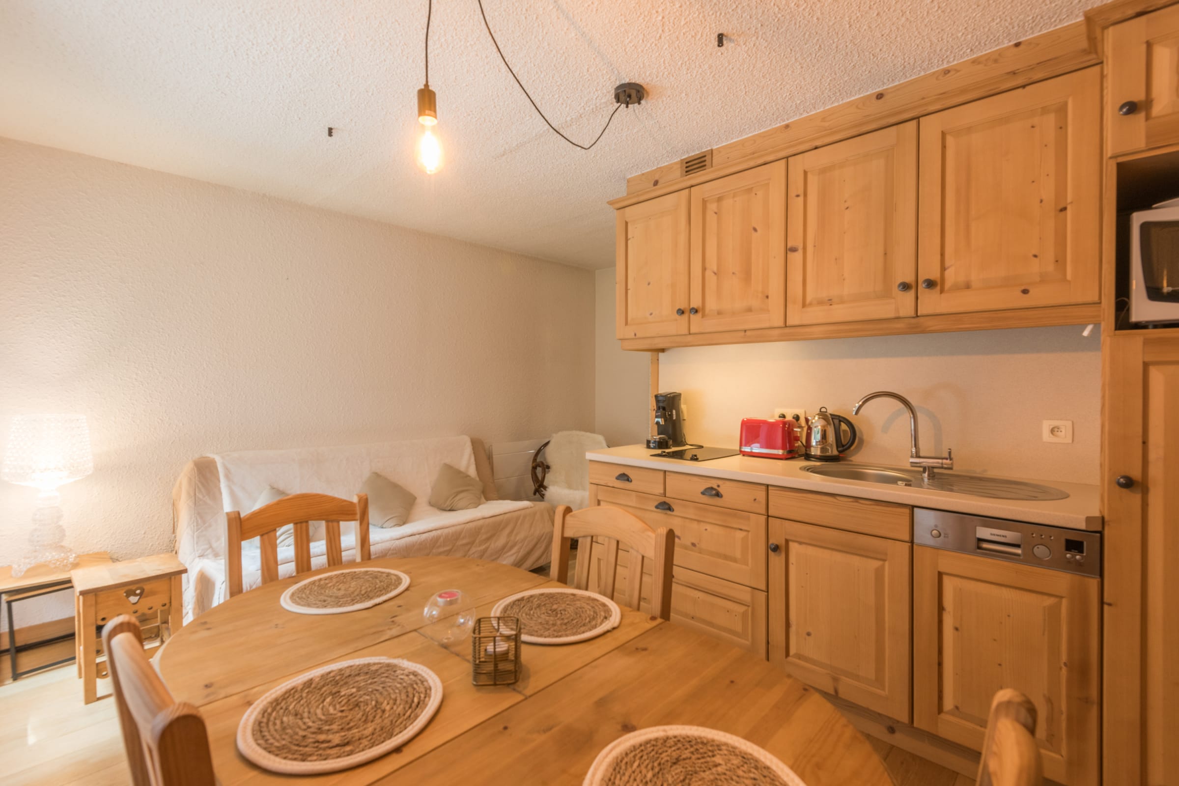 - a convivial living room with sofa bed and dining table,