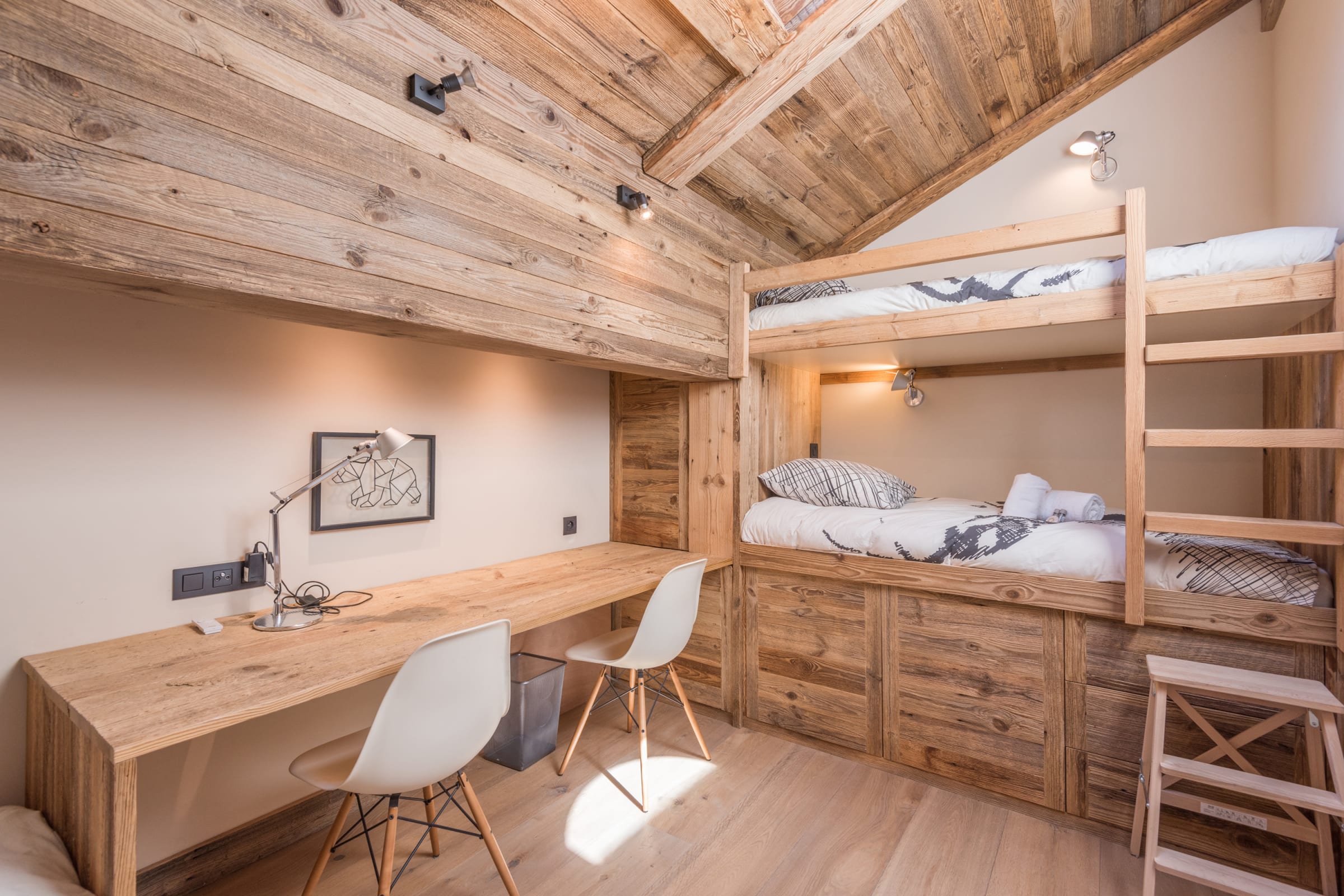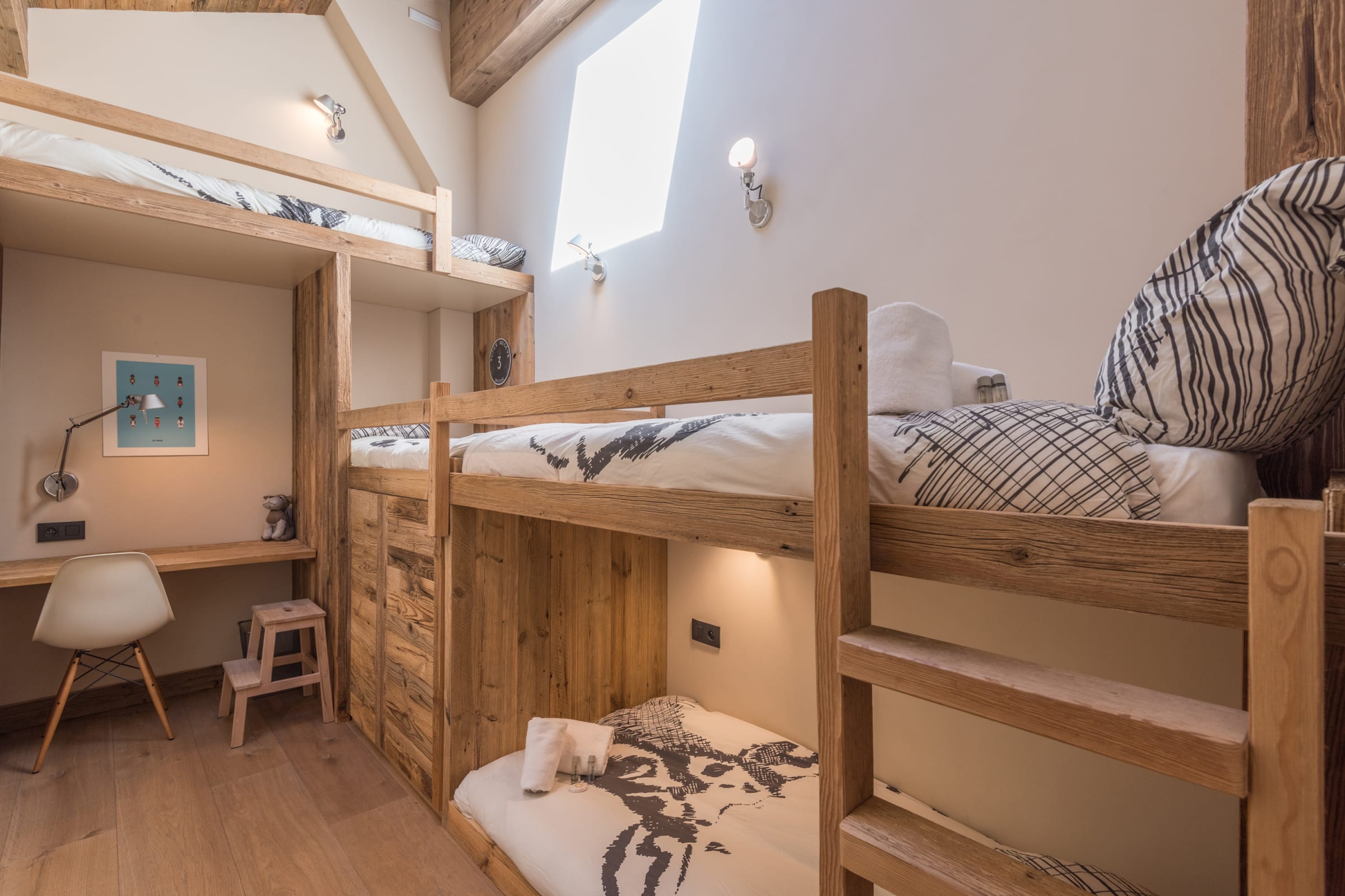 - a bedroom with two single bunk beds and a workspace,