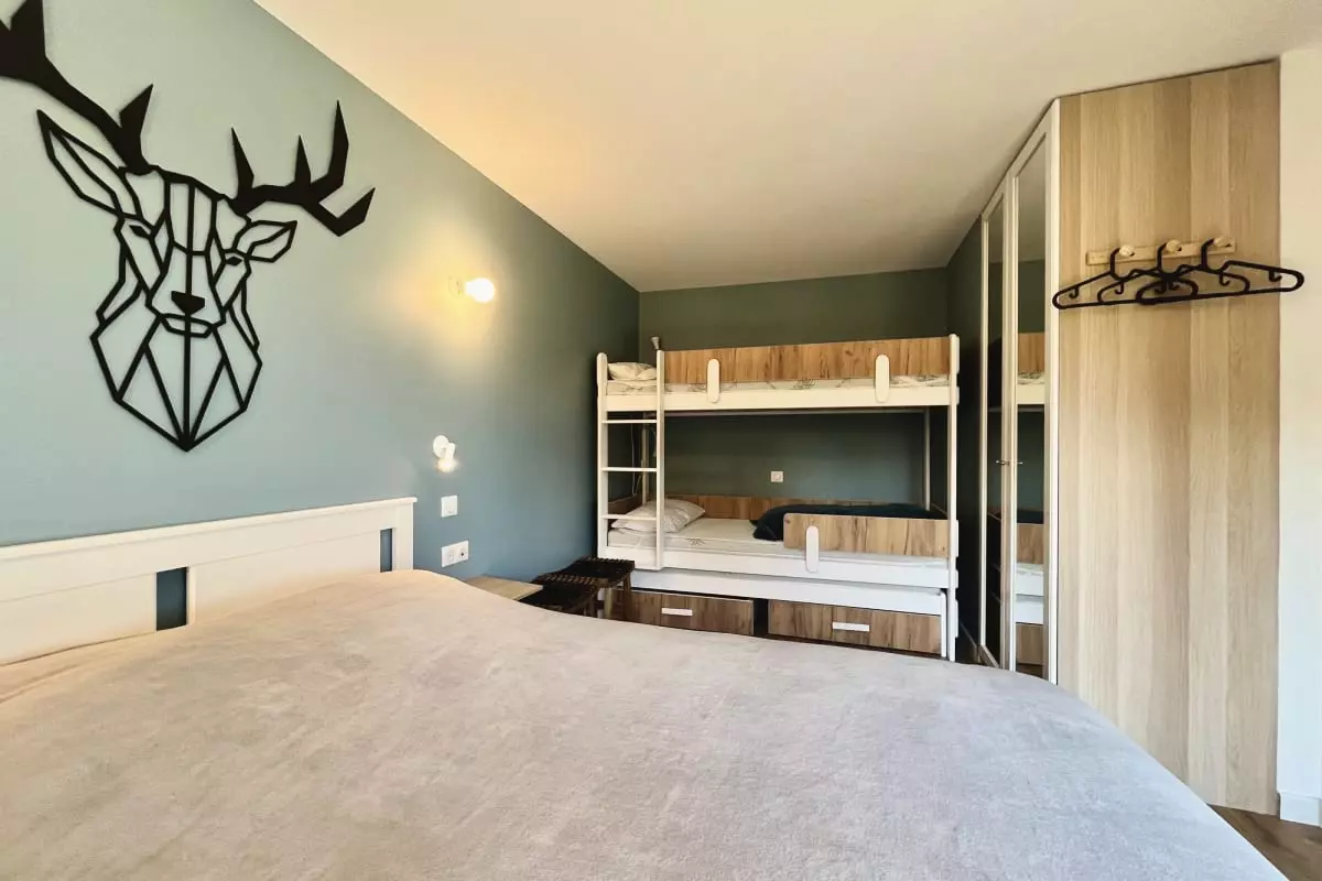 - a bedroom with a double bed and a bunk bed;