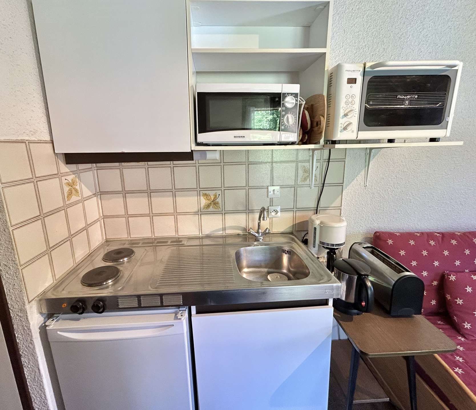 This flat comprises an entrance hall, a bedroom with a double bed (140 x 190) and wardrobes, a bathroom, a separate toilet, a kitchenette opening onto the living room with a single sofa bed and a pull-out bed (80 x 190), a television and access to the north-east-facing balcony.