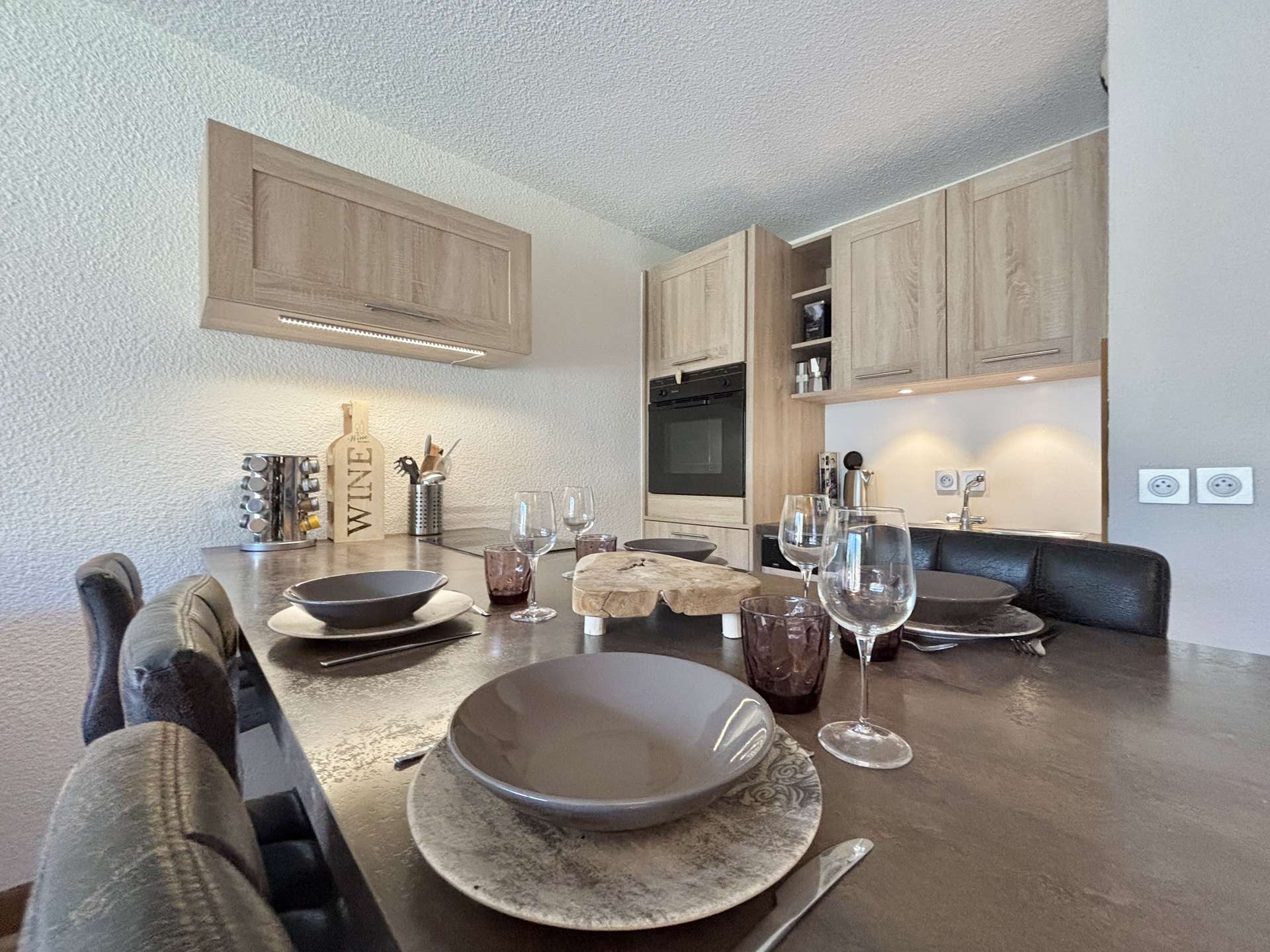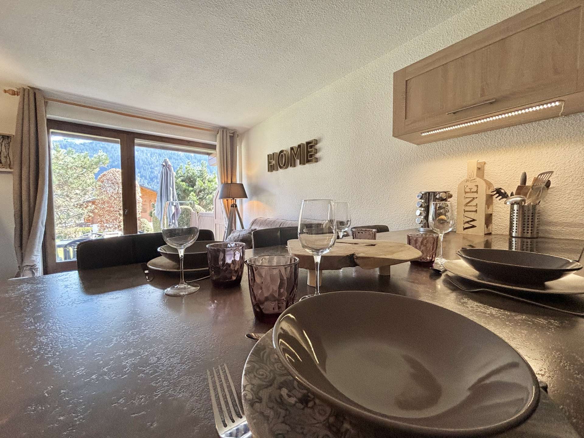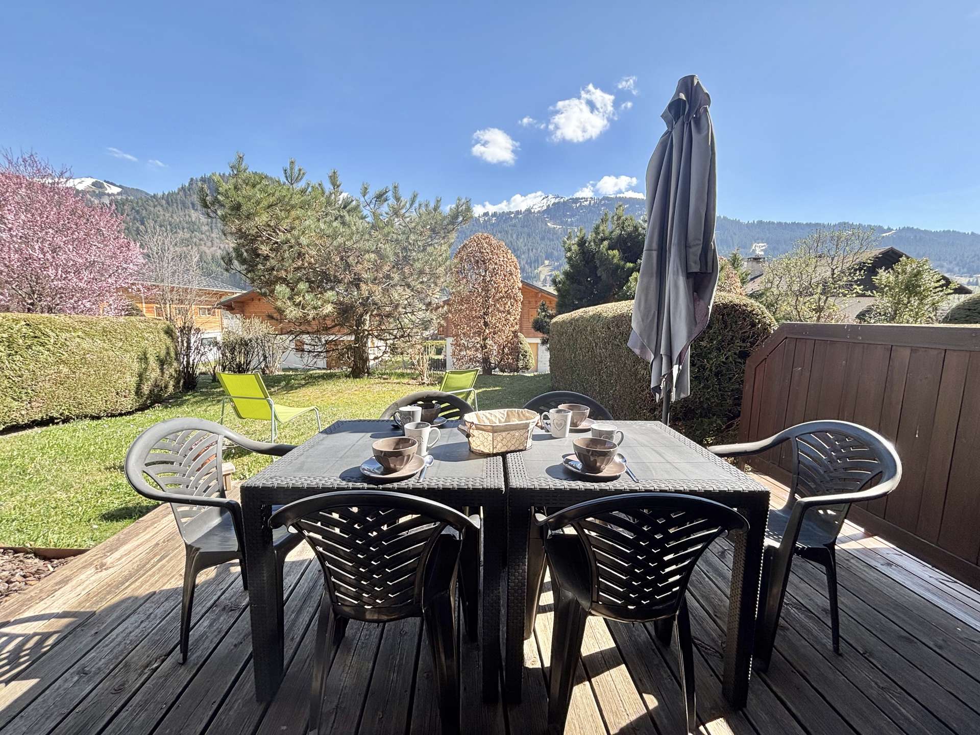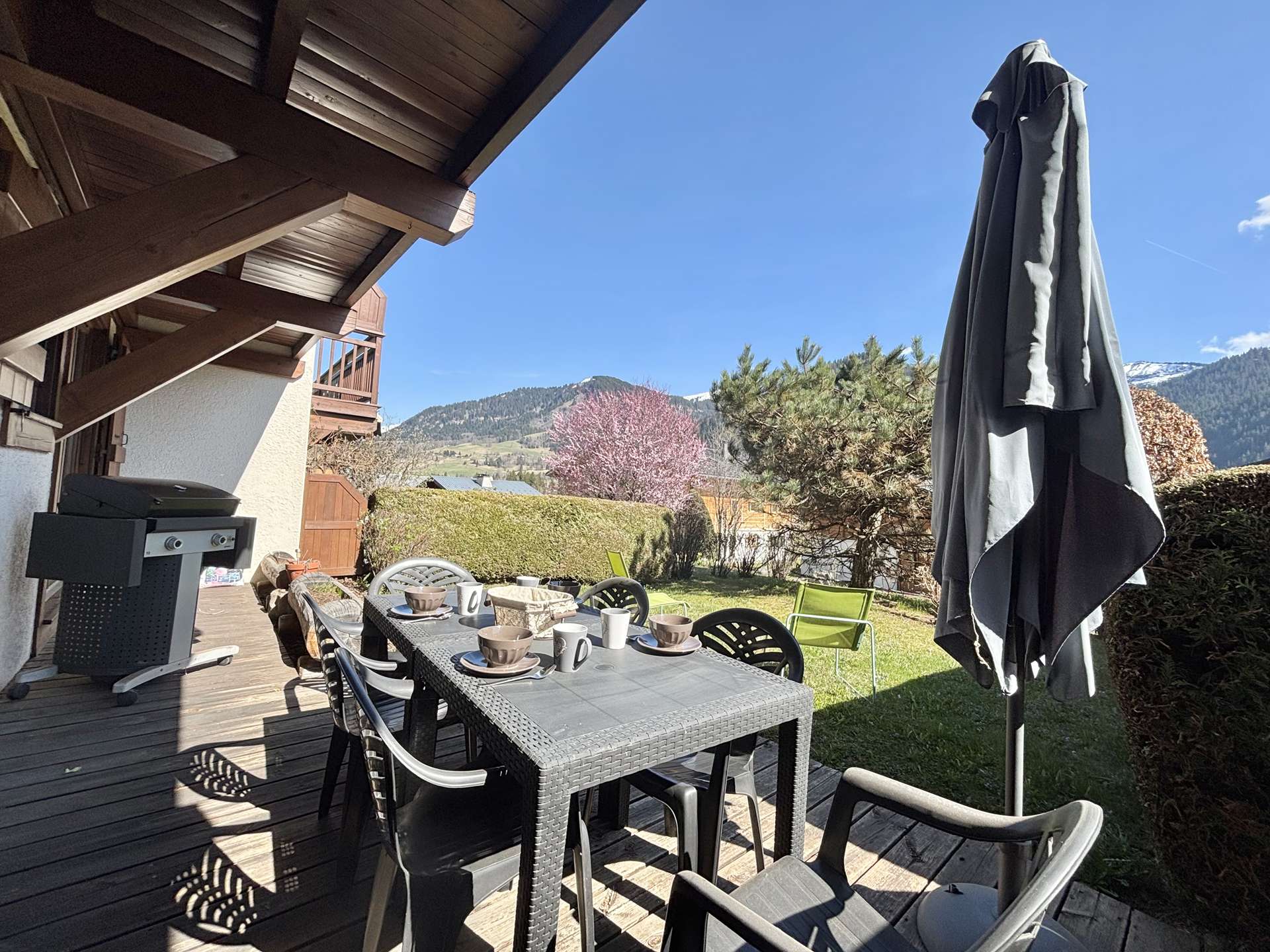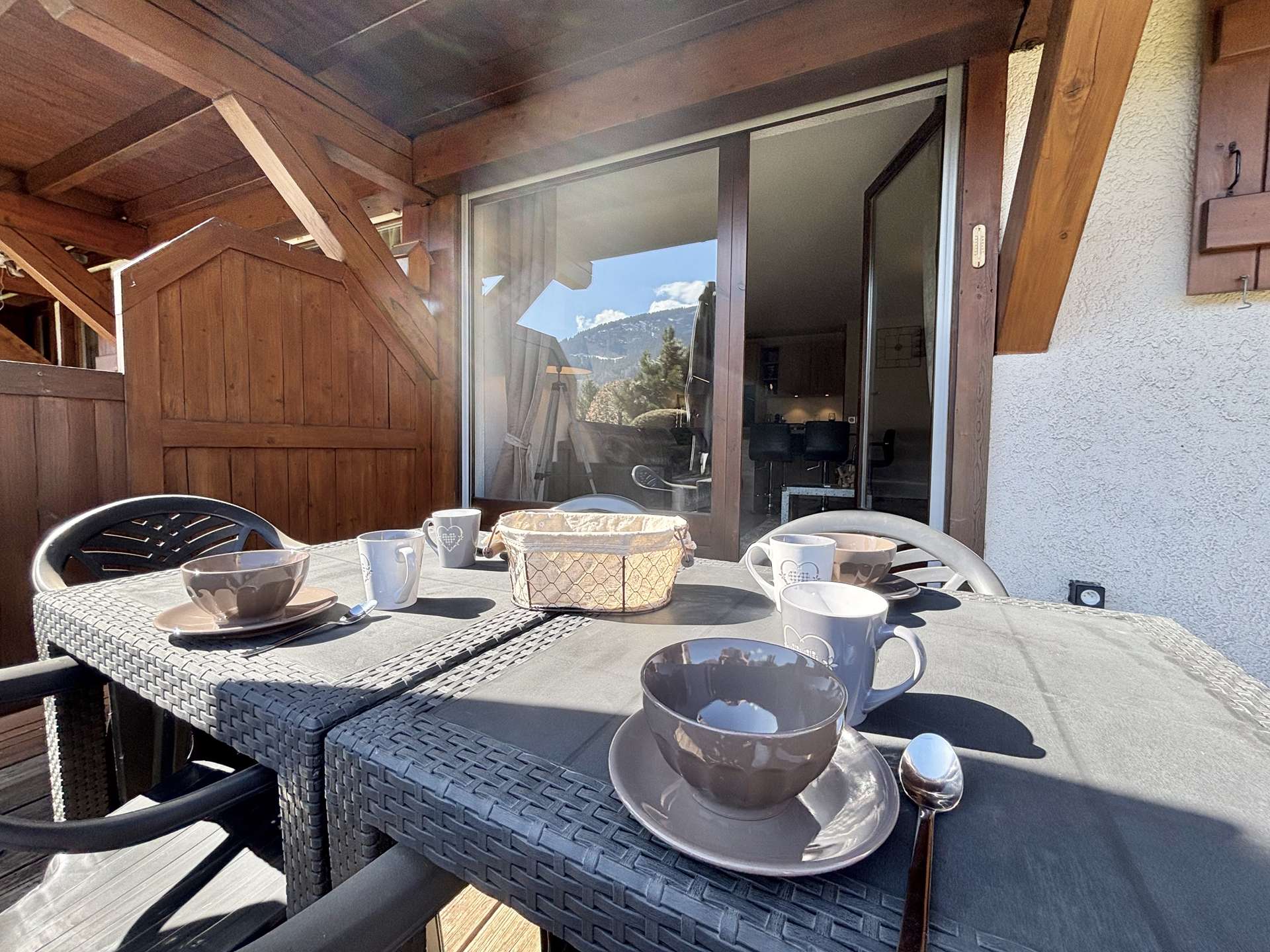 The rental benefits from an enclosed indoor car park that doubles as a ski locker. The south-facing terrace overlooks the ski slopes.